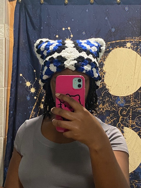 Large 8 Squared Cat Hat with Black / Blue / White color scheme.